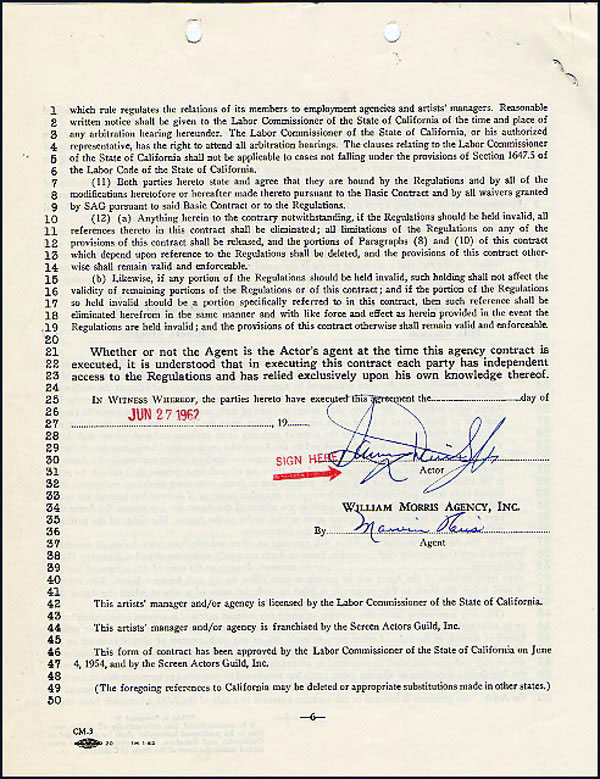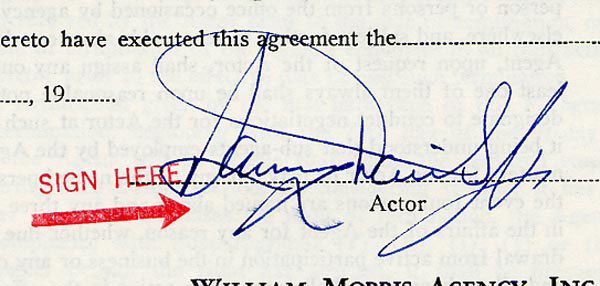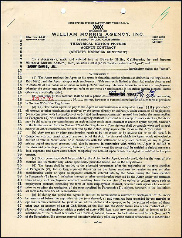 DS, three pages both sides, 8.5 x 11, William Morris Agency letterhead, June 27, 1962. Theatrical motion picture agency contract for a period of one year at the usual commission rate of 10 percent. Davis has signed on the reverse of the third page and initialled the first page. In fine condition, with usual file and staple holes, a green ink office notation. RRAuction COA.