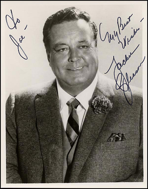Glossy 7 x 9 photo of the sharply dressed Gleason, signed and inscribed in black felt tip 'To Joe - My best wishes, Jackie Gleason.' In fine condition. RRAuction COA.