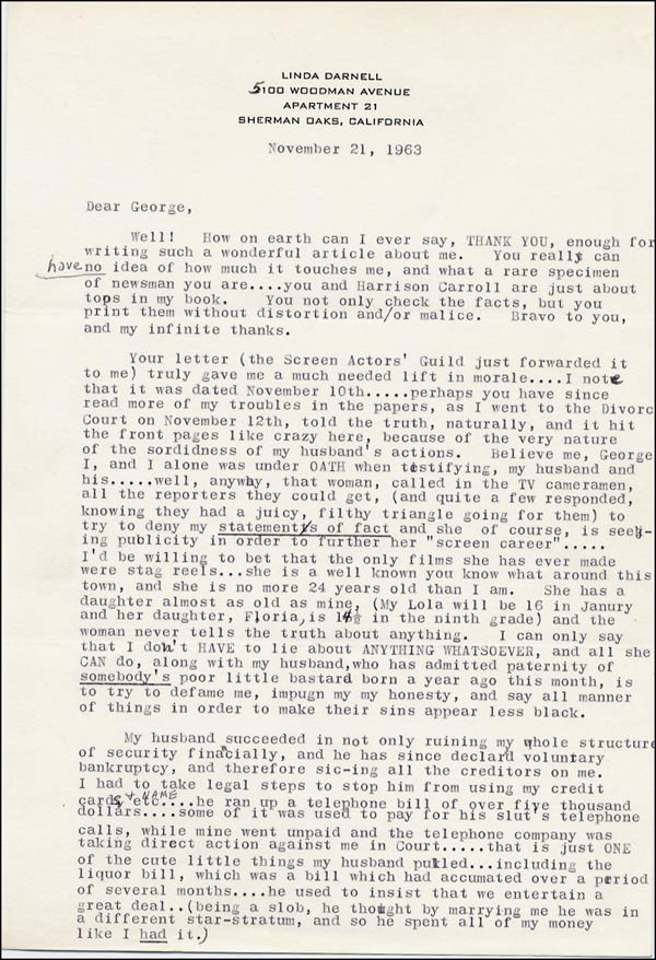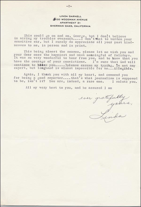 Often described as the "girl with the perfect face," she died in a fire at the age of 41. Terrific content TLS signed 'Linda,' with her own handwritten edits, two pages, 7.25 x 10.5, personal letterhead, November 21, 1963. In part: 'Your letter truly gave me a much needed lift in morale...perhaps you have since read more of my troubles in the papers, as I went to the Divorce Curt on November 12, and it hit the papers like crazy here, because of the very nature of the sordidness of my husband's actions. I can only say that I don't HAVE to lie about ANYTHING WHATSOEVER and all she CAN do, along with my husband, who has admitted paternity of somebody's poor little bastard born a year ago is to try to defame me, impugn my honest and say all manner of things in order make their sins appear less black. I'm sure that God will continue to bless you...please excuse my typing, I'm not any expert, but longhand is almost impossible for me...illegible. I thank you with all my heart, and commend you for being a good reporter...that's what journalism is supposed to be, isn't it? You, indeed, a rare one. I salute you. Ever gratefully yours, Linda.' Accompanied by an unsigned photo of the actress. In fine condition. RRAuction COA.