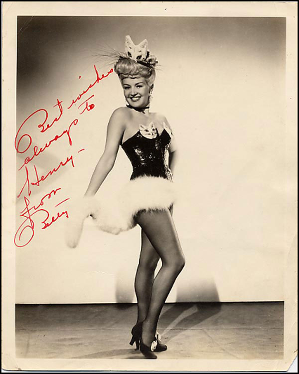 Lovely matte-finish 8 x 10 full-length photo of a costumed Grable with her famed legs in full view, signed and inscribed in red ink 'Best wishes to always to Henry - from Betty.' In fine condition, with scattered light creasing, corner creases, chipped lower right corner. RRAuction COA.
