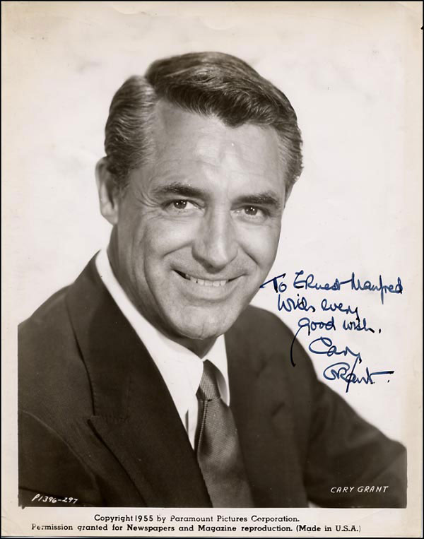 Vintage glossy 8 x 10 Paramount publicity photo from 1955, signed and inscribed in fountain pen 'To Ernest Manfred, With every good wish, Cary Grant.' Some light border toning and some scattered light surface impressions and dings, otherwise fine condition. RRAuction COA.