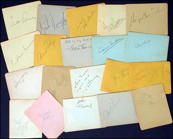Lot of forty four signatures, mostly in fountain pen and pencil, on off-white album pages, with some signatures on both sides, and several adding signatures or sentiments. Signers include: Ted Healy, James Stewart, Fred MacMurray, Ann Sheridan, Hoagy Carmichael, George Sanders, John Howard, Betty Grable, Kirk Douglas, Jeanne Cagney and Akim Tamiroff. In fine condition, with some light toning or soiling to several pages. RRAuction COA.