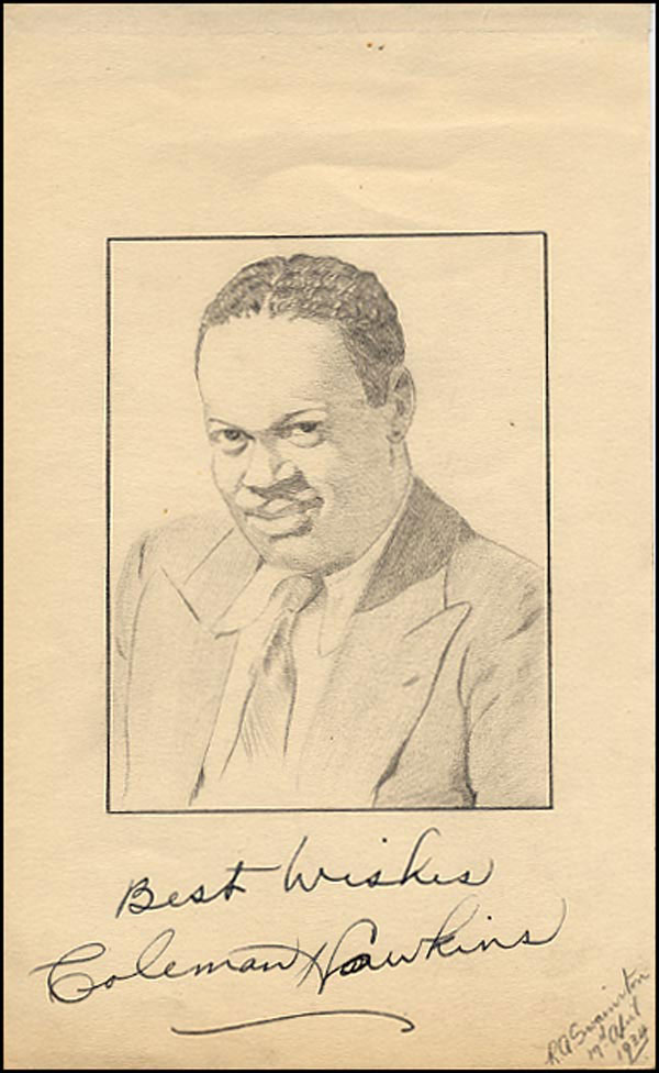 Original signed pencil sketch of portrait of Hawkins by R. A. Swainston, dated April 19, 1934, on an off-white 5.5 x 9 sheet, signed in the lower border in fountain pen, 'Best wishes, Coleman Hawkins.' In fine condition, with some light toning to bottom edge. RRAuction COA.