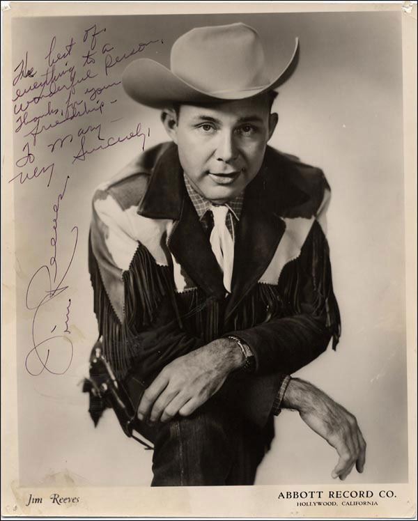 Country-pop star who enjoyed international fame until his death in 1964. Vintage glossy 8 x 10 Abbott Record Co. promotional photo, signed and inscribed in fountain pen 'The best of everything to a wonderful person. Thanks for your friendship - To Mary - Very sincerely, Jim Reeves.' Some light spill remnants to left side of image, lightly over a few letters of signature, town out tack holes to top corners and a few surface dings, otherwise fine condition. RRAuction COA.
