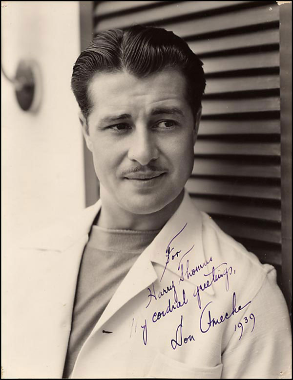 Vintage glossy 8 x 10 photo, signed and inscribed in purple fountain pen 'For Harry Thomas, My cordial greetings, Don Ameche 1939.' In fine condition, with trimmed edges and a tack hole and minor surface loss to corners. RRAuction COA.