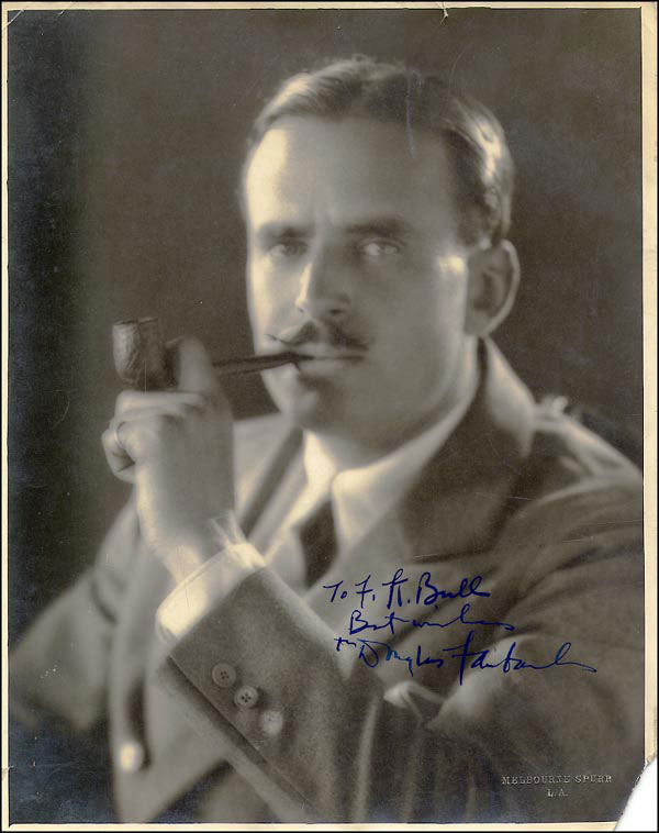 Vintage 11 x 14 Spurr photo of Fairbanks with his pipe, signed and inscribed in fountain pen 'To F. H. Bull, Best wishes from Douglas Fairbanks.' In fine condition, with some small tears along top edge, missing lower right corner, traces of light silvering and a few scattered surface marks. RRAuction COA.