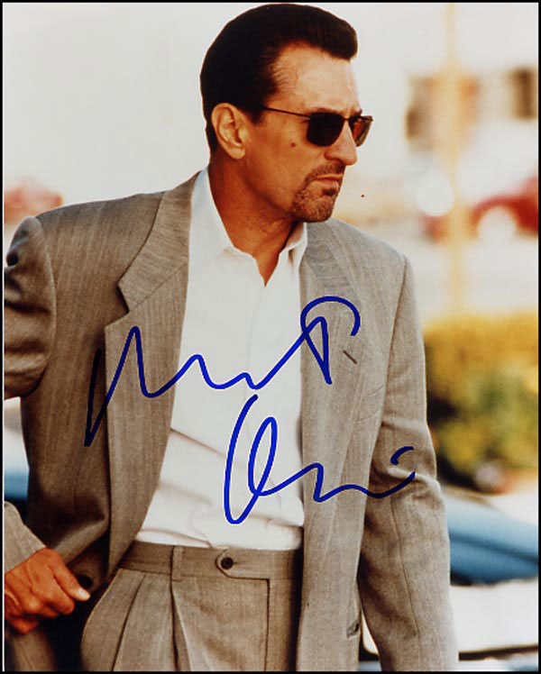 Color glossy 8 x 10 photo of the actor wearing a light colored suit and sunglasses as Neil McCauley in the film Heat, signed in blue felt tip. In fine condition. RRAuction COA.