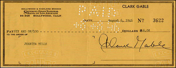 Personal check, 8.5 x 3.25, filled out in type and signed by Gable, payable to Juanita Bills for 6.08, August 6, 1946. In fine condition, with a bisecting vertical fold and cancellation holes to top, none affecting clean signature. RRAuction COA.