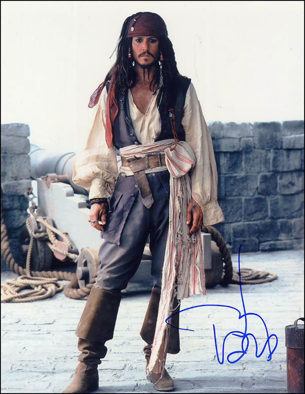 Absolutely jaw-dropping color glossy 11 x 14 full-length photo of Depp as Captain Jack Sparrow, signed in blue felt tip. In fine condition. RRAuction COA.