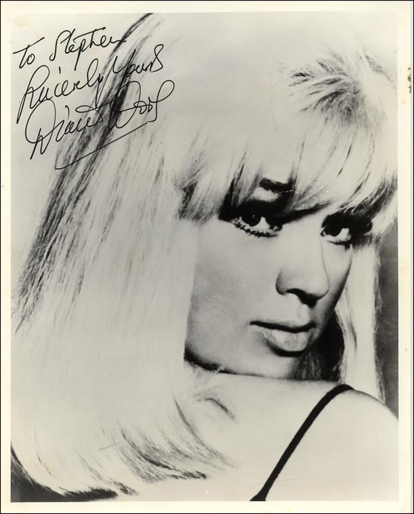 Promoted as the English Marilyn Monroe. Glossy 8 x 10 photo of Dors looking over her shoulder, signed and inscribed in black felt tip 'To Stephen, Sincerely yours, Diana Dors.' In fine condition, with a few scattered light surface marks. RRAuction COA.