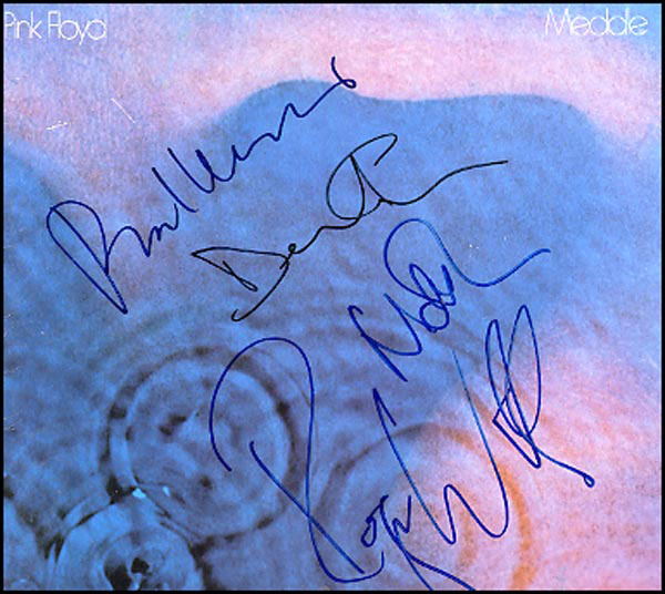 Meddle album signed on the front cover in blue felt tip by Roger Waters, Nick Mason and Richard Wright and in black felt tip by David Gilmour. In fine condition, with some light edge wear. The record is not included. COA Roger Epperson/PSA/DNA and RRAuction COA.