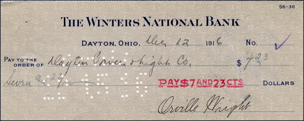 Check, 7.5 x 3, filled out in another hand and signed by Wright, payable to Dayton Power and Light Co. for 7.23, December 12, 1916. In fine condition, with cancellation holes to body, small staple hole to top left and a vertical fold only affecting the connecting line between two letters of signature. RRAuction COA.