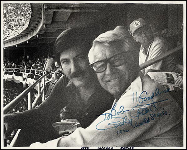 Glossy 10 x 8 photo of Grant and a companion at the 1974 World Series, signed and inscribed in blue felt tip 'To Bob!! Good luck, Cary Grant 1974 - World Series.' In fine condition, with some light creasing, mostly to the edges and image a bit grainy. RRAuction COA.