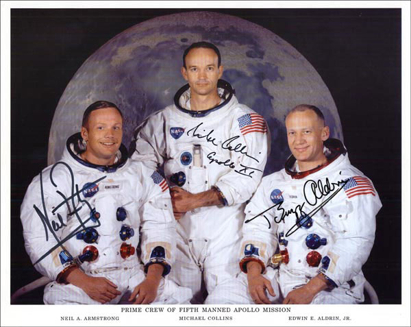 Fantastic color 10 x 8 NASA photo of the primary crew of Apollo 11 crew in their spacesuits against a lunar backdrop, signed in black felt tip by Neil Armstrong, Buzz Aldrin and Michael Collins, who adds 'Apollo XI.' A few little surface wrinkles, otherwise very fine condition. RRAuction COA.
