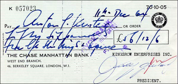 Business check, 6.25 x 3, filled out in another hand and signed by Garland, payable to Anton Vente for 56.12.6, December 11, 1964. Cancellation holes and stamps to body, bisecting vertical fold and an ink cancellation mark affecting last name of signature, otherwise fine condition. RRAuction COA.