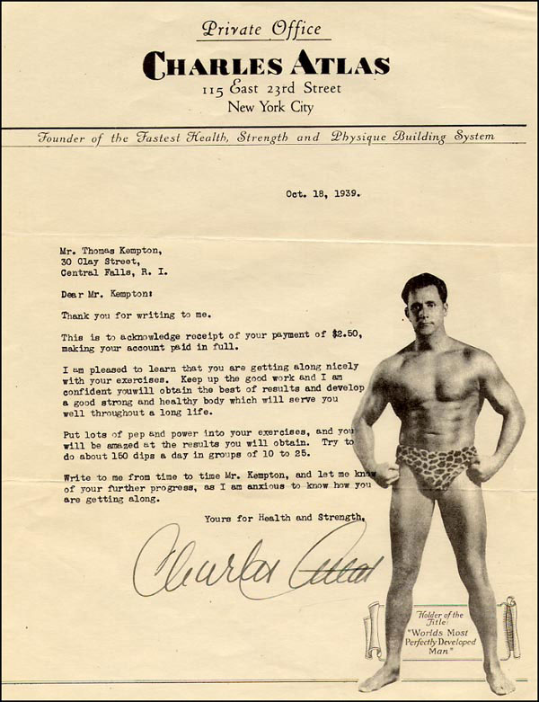 TLS, one page, 8.5 x 11, Private Office of Charles Atlas letterhead, October 18, 1939. Letter of encouragement to an Atlas follower. In part, 'I am pleased to learn that you are getting along nicely with your exercises. Keep up the good work and I am confident you will obtain the best of results and develop a good strong and healthy body which will serve you well throughout a long life.' Accompanied by the original mailing envelope. In fine condition, with expected mailing folds and a few light creases. RRAuction COA.