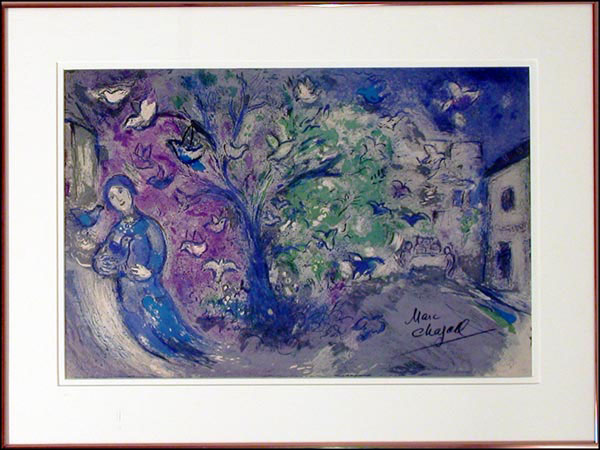 Color 18.5 x 12 print of one of Chagall's works, signed in black artist's pencil, 'Marc Chagall.' Double matted and framed to an overall size of 24 x 18. In fine condition. RRAuction COA.
