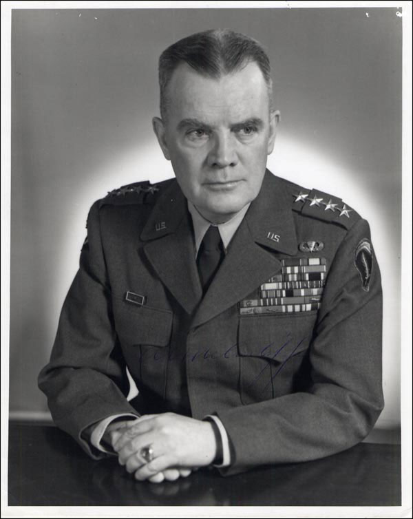 Brigadier general credited with checking the German counter-attack in the Ardennes; when ordered to surrender by the German forces he sent a simple reply: 'Nuts!' Matte-finish 8 x 10 photo of McAuliffe in uniform, signed in blue ballpoint, 'A. McAuliffe.' In fine condition, with a bit of light signature contrast. RRAuction COA.