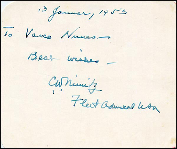 Fountain pen signature and inscription, 'To Vasco Nunes - Best wishes - C. W. Nimitz, Fleet Admiral USA,' on an off-white 5.5 x 4.5 album page, dated January 13, 1953. In fine condition. RRAuction COA.