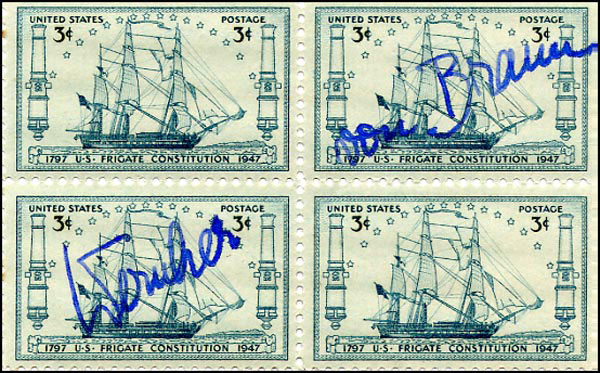 Four block sheet of three cent postal stamps, 3.25 x 2, honoring the USS Constitution, signed across the front in blue ink. In fine condition. RRAuction COA.