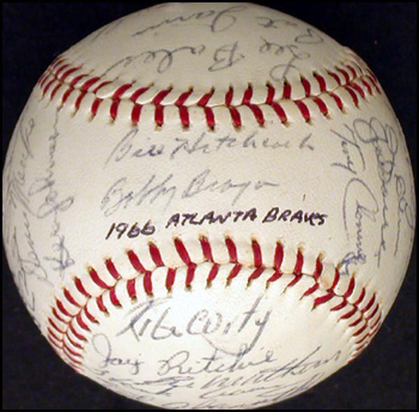 Official Rawlings National League baseball signed in ballpoint by 31 members of the 1966 Atlanta Braves. Signers include: Aaron, Mathews, Torre, Bragan, Niekro, Alou, Carty and others. In fine condition, with a few signatures a bit light, but legible. COA Mike Gutierrez/Global and RRAuction COA.
