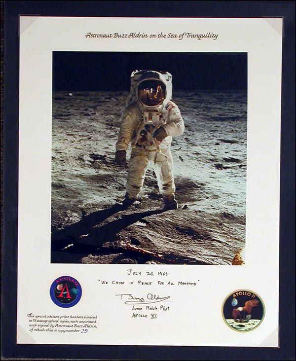 Color limited edition 16 x 20 print, numbered number 29/75, signed in black felt tip, "We came in peace for all mankind - Buzz Aldrin, Lunar Module Pilot, Apollo XI.' Matted to an overall size of 18 x 22. In fine condition. RRAuction COA.