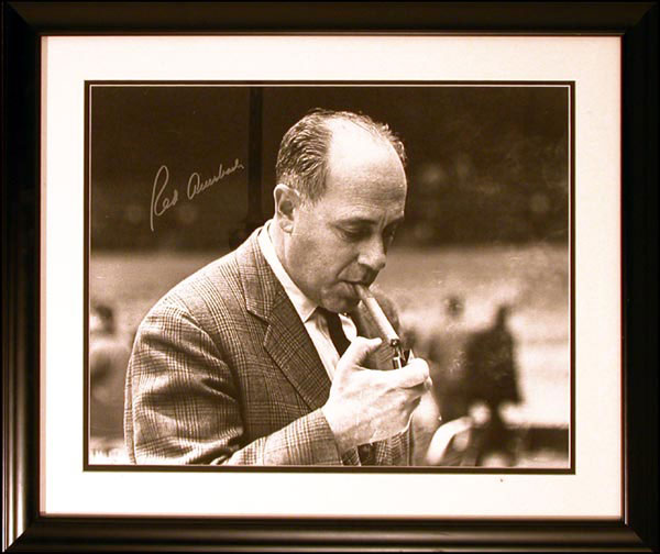 Classic 20 x 16 photo of Auerbach lighting his customary victory cigar, signed in silver ink. Double matted and framed to an overall size of 27 x 23. In fine condition. COA Sports Images and RRAuction COA. Oversized.