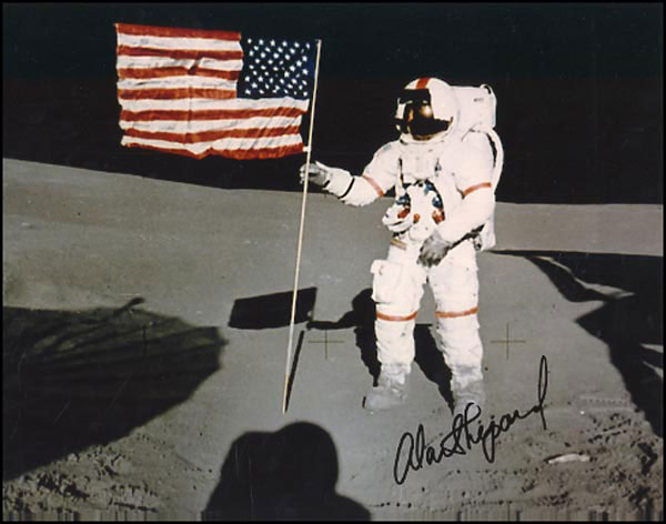 Great color satin-finish 14 x 11 photo of Shepard on the surface of the moon, signed in black felt tip. In fine condition. RRAuction COA.