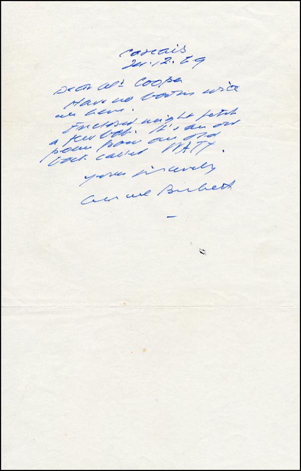 Irish author and playwright, winner of Nobel Prize for Literature. ALS, one page, 5.25 x 8.25, January 12, 1969 [?]. In part: 'Dear Al Cooper, Have no books [?] which are here. Enclosed [?] fetch a few bob. It's an old...[?] Yours sincerely, Samuel Beckett.' Accompanied by the original air mail envelope in Beckett's hand with Portuguese stamps. In fine condition, with scattered light creasing affecting nothing. RRAuction COA.