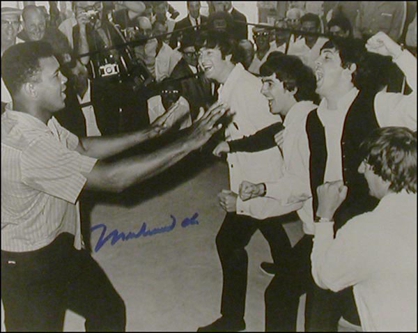 Glossy 10 x 8 photo of Ali clowning in the ring with the Beatles in 1964, signed in blue felt tip by Ali. Matted and framed to an overall size of 16.5 x 14.5. In fine condition. COA Steve Grad/PSA/DNA and RRAuction COA.