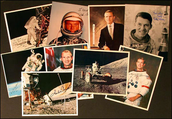 Lot of nine signed color 8 x 10 photos (four are NASA photos) of astronauts includes: Buzz Aldrin preparing to step onto the moon (NASA); John Glenn in his space suit; Frank Borman standing beside a model of a spacecraft (NASA); Wally Schirra in his space suit (black and white photo); Bruce McCandless (adding 'STS -11/41-B' beneath his signature) (NASA); Vance Brand in his space suit; Dave Scott in his space suit; Gene Cernan in the rover, prior to loadup (NASA); and, Charles Conrad, Jr. on the surface of the moon (NASA). Most are inscribed 'To David' and all are signed in black or blue felt tip. In fine condition. RRAuction COA.