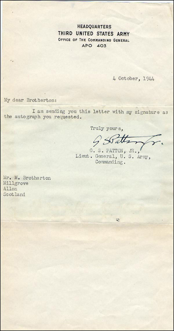 TLS signed 'G. S. Patton, Jr.,' one page, 5.25 x 10, Headquarters, Third United States Army letterhead, October 4, 1944. Brief letter to a collector. In full, 'I am sending you this letter with my signature as the autograph you requested.' In fine condition, with trimmed vertical edges, cardboard backing to center portion of letter resulting in some wrinkling to folds, not affecting signature, which in itself is in an ideal location for matting. RRAuction COA.
