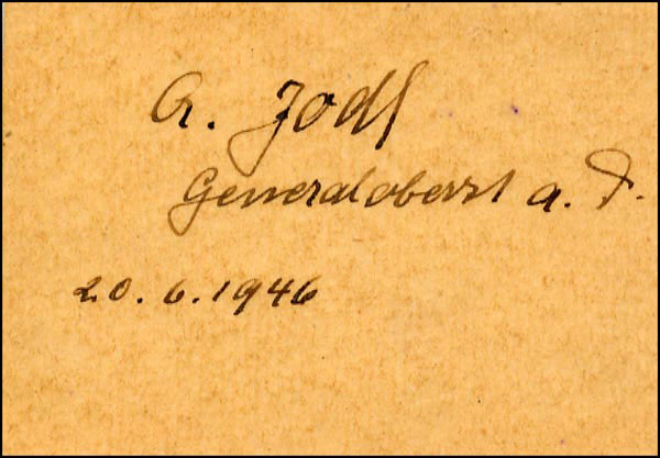 As Karl Donitz's representative, Jodl signed Germany's capitulation on May 7, 1945. He was later tried at Nuremberg, sentenced to death, and hanged for war crimes. Fountain pen signature, 'A. Jodl, Generaloberst,' on an off-white 4 x 3 card, dated June 20, 1946. 'Cell 6,' has been written on the reverse in another hand. In fine condition, card laminated. RRAuction COA.