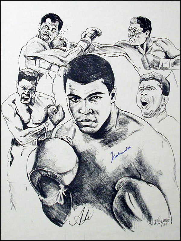 Very nice composite print of Ali, 18 x 24, nicely signed in blue felt tip. In fine condition. Rolled. COA Steve Grad/PSA/DNA and RRAuction COA.