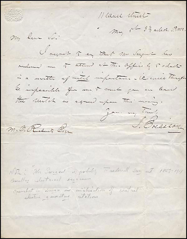 Army engineer who designed and built the ironclad Monitor for the US government. ALS signed 'J. Ericsson,' one page, 8.5 x 10.75, no date. Letter to a gentleman in his rather difficult to decipher writing stating 'Mr. Sargus has ordered me to attend at their office by 1 o'clock in a matter of vital importance - it will therefore be impossible for me to meet you.' Some light toning and wrinkling and a pencil notation to lower portion of page, otherwise fine condition. RRAuction COA.