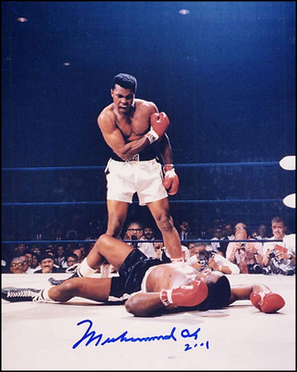 Color satin-finish 8 x 10 photo of Ali standing over Sonny Liston, signed in blue felt tip, 'Muhammad Ali 2001.' In fine condition. COA Steve Grad/PSA/DNA and RRAuction COA.