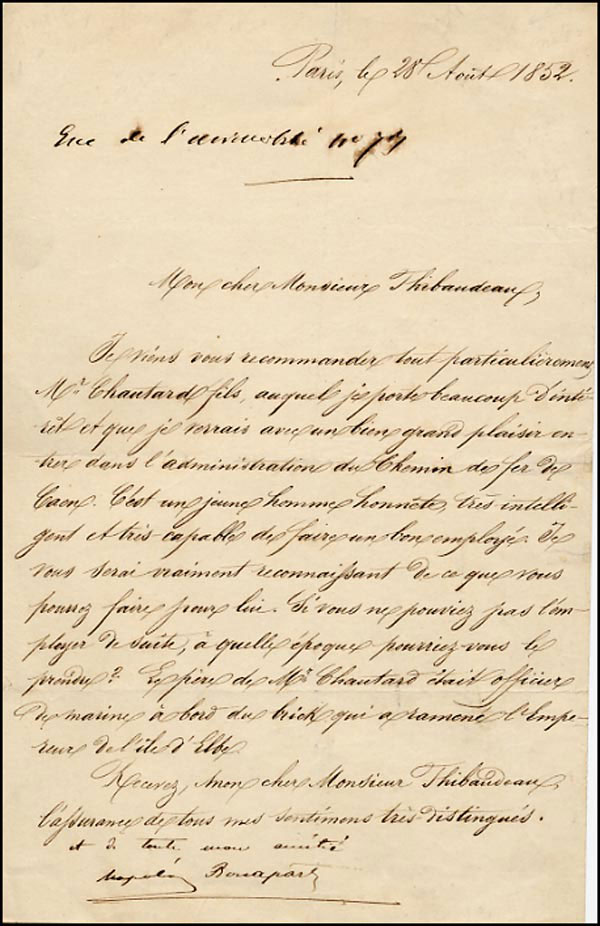 Popular French Emperor who married the beautiful Countess Eugenie. LS in untranslated French, signed in full, 'Napoleon Bonaparte,' adding in his hand, in French, 'and all my friendship,' one page, 5 x 8, April 28, 1852. In fine condition, with two horizontal folds and some light wrinkling. RRAuction COA.