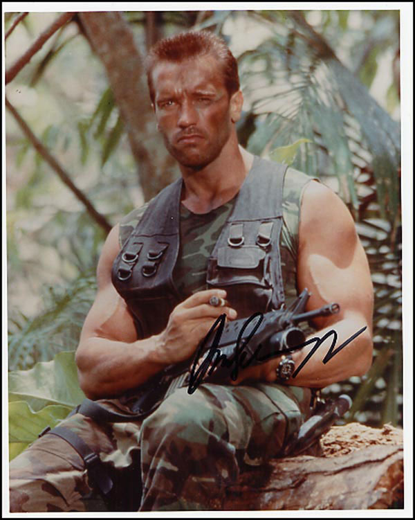 Color glossy 8 x 10 photo of Schwarzenegger from Predator, signed in black felt tip. In fine condition. RRAuction COA.