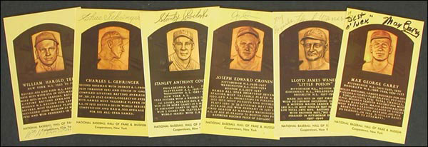 Lot of six gold Hall of Fame plaque cards, 3.5 x 5.5, signed on the top in ballpoint or felt tip by the respective Hall of Famer: Max Carey, Lloyd Waner, Joe Cronin, Chas. Gehringer, Stan Coveleski and Bill Terry. In fine condition, with a couple of signatures on the light side. RRAuction COA.