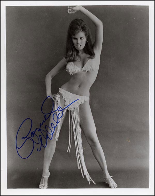 Lot of two different signed glossy 8 x 10 photos of the buxom beauty includes a full-length photo of Welch in a white sequined bikini, signed in blue felt tip; and, a photo of Welch emerging from the waves in a light colored bikini, also signed in blue felt tip. In fine condition. RRAuction COA.
