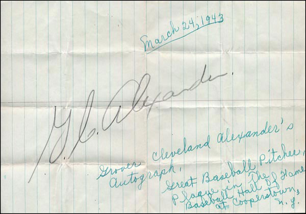 Pencil signature, 'G. C. Alexander,' on a light green 8.5 x 6 lined sheet. In fine condition, with horizontal and vertical folds and collector's notations above and below signature, indicating signature was acquired in 1943. COA Steve Grad/PSA/DNA and RRAuction COA.