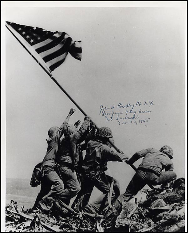 Lot of two signed photos. Glossy 8 x 10 photo of the Iwo Jima flag raising, signed in black ballpoint 'John H. Bradley, Iwo Jima Flag Raiser, Mt. Surabachi, Feb. 23, 1945,' and a 10 x 8 photo of Bradley on crutches, also signed in black felt tip in the same manner. In fine condition, with a few creases to second photo. RRAuction COA.