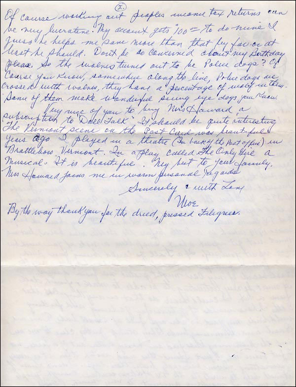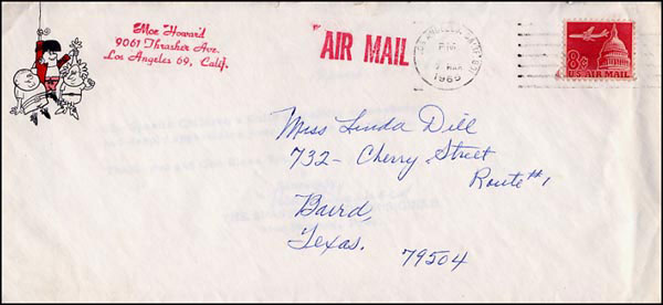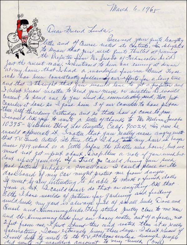 ALS signed 'Moe,' one page both sides, 8.5 x 11, Three Stooges letterhead, March 6, 1965. Letter to a fan in Texas, to whom Howard had arranged a projector to be sent for watching Three Stooges films. In part, 'I'm delighted to know that you were quite thrilled at receiving the projector from Mr. Jacobs of Technicolor...I didn't know weather [sic] to send you mine or weather [sic] he would consent to send one to you and he immediately said Moe, just consider it done, so I gave him three of our comedies...I notice that you really were angry with that T. V. Guide article. It's true that I had worn my hair in bangs since 1919 which is a little before the Beatles were born, but we must not get upset about.' Accompanied by the original Three Stooges mailing envelope, addressed in Moe's hand. In fine condition. RRAuction COA.
