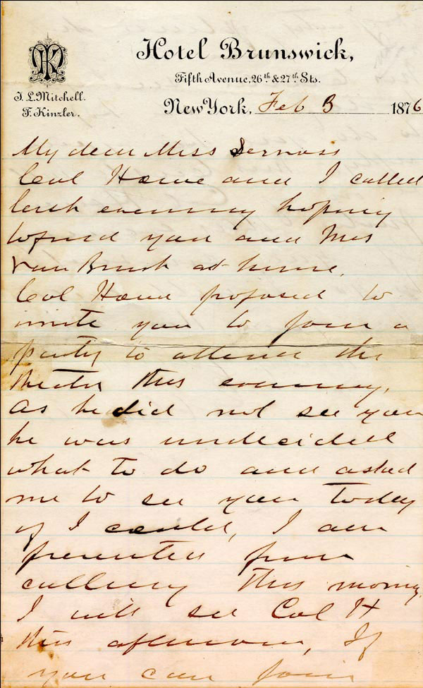 ALS signed 'G. A. Custer,' one lightly-lined page, both sides, 5 x 8, Hotel Brunswick letterhead, February 8, 1876. Letter to a lady. In part, 'Col. House proposed to invite you to join a party to attend the theatre this evening. As he did not see you he was undecided what to do and asked me to see you today if I could, I am prevented from calling this morning. I will see Col. H. this afternoon, if you can join the party please drop me a line or if Mrs. Custer sees you today as she hoped to do, give her your reply. Mrs. Custer will be one of Col. House's party...If you consent to go I will call for you this evening.' In very good condition, with a clean and repairable separation along an old repair to bisecting horizontal fold, some scattered light toning and soiling and a clean signature. A very interesting letter from Custer regarding the theatre in New York, only six months before meeting his demise at Little Big Horn. COA John Reznikoff/PSA/DNA and RRAuction COA.