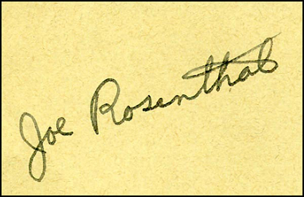 Photographer of Marines raising flag on Iwo Jima. Fountain pen signature on a pale green 4.75 x 3 album page matted with a color 6.5 x 10.5 magazine photo of the flag raising to an overall size of 16 x 20. In fine condition, with the added 'Photographer of Marines raising flag on Mount Suribachi: Most famous photo of World War two' in another hand beneath Rosenthal's signature. RRAuction COA.
