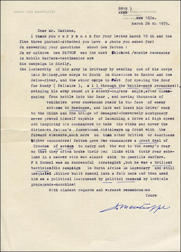 German Panzer general in WW II, a military strategist whose skillful and imaginative deployment of tanks repeatedly thwarted Allied offensives. TLS signed 'H. v. Manteuffel,' one page, 8.25 x 11.5, personal letterhead, March 26, 1975 with fantastic, insightful commentary. In part: 'In answering your questions about Gen. Patton: In my opinion Gen Patton was the most talented/enable commander in Mobile Warfare - testimonies are his campaign in Sicily, the leadership of his army in Brittany. Patton gave the commanders a great deal of freedom of action to carry out the war to enemy's rear so that they often broke their own links with their rear echelons in a manner wich [sic] was almost akin to guerilla warfare. Rommel was no successful strategist, but he was a brillant [sic] tactician. His campaign in North Africa is legendary and still unequalled. Hitler built Rommel into a folk hero and then used him as a political instrument by Goebbels propagande-machine!' In fine condition. RRAuction COA.