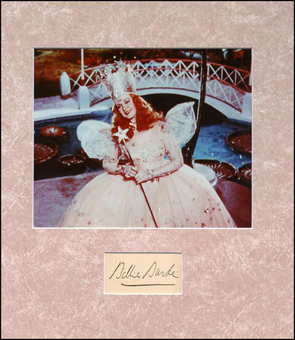 Fountain pen signature, 'Billie Burke,' on an off-white card. Matted and framed with a color photo of Burke as Glenda, to an overall size of 13 x 14. In fine condition. RRAuction COA.