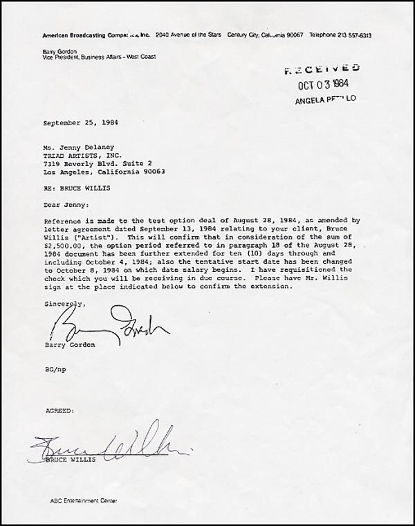 DS, one page, 8.5 x 11, American Broadcasting Company letterhead, September 25, 1984. In part: 'This will confirm that in consideration of the sum of 2,500.00, the option period has been further extended for ten (10) days.' Signed 'Bruce Willis' in black ink. In fine condition. RRAuction COA.
