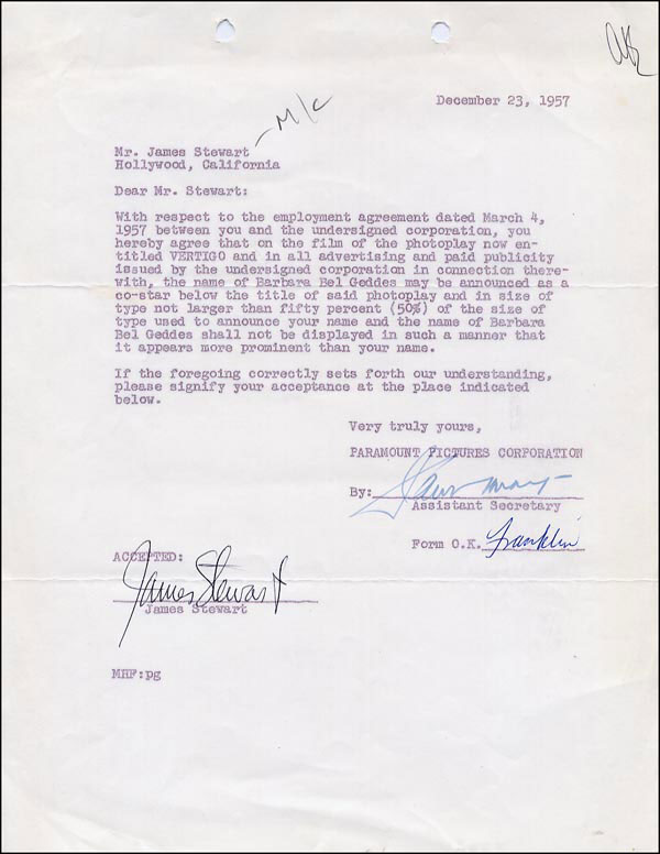 DS, one page, 8.5 x 11, December 23, 1957. Stewart and Paramount Pictures come to an agreement stating that for the film Vertigo, that 'the name of Barbara Bel Geddes may be announced as a co-star below the title of said photoplay and in size of type not larger than fifty percent (50 percent) of the size of type used to announce your name.' Signed at the bottom in fountain pen by Stewart. In fine condition, with two punch holes to top edge. RRAuction COA.