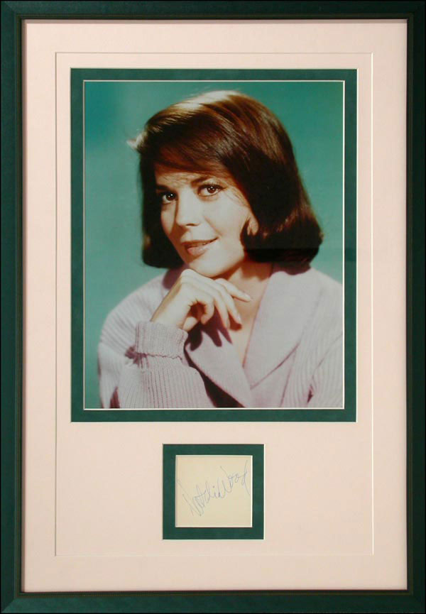 Ink signature, 'Natalie Wood,' on an off-white card. Archivally triple matted and framed with a lovely color 11 x 14 photo of Wood in a pink sweater, to an overall size of 17.5 x 25. In fine condition. RRAuction COA. Oversized.